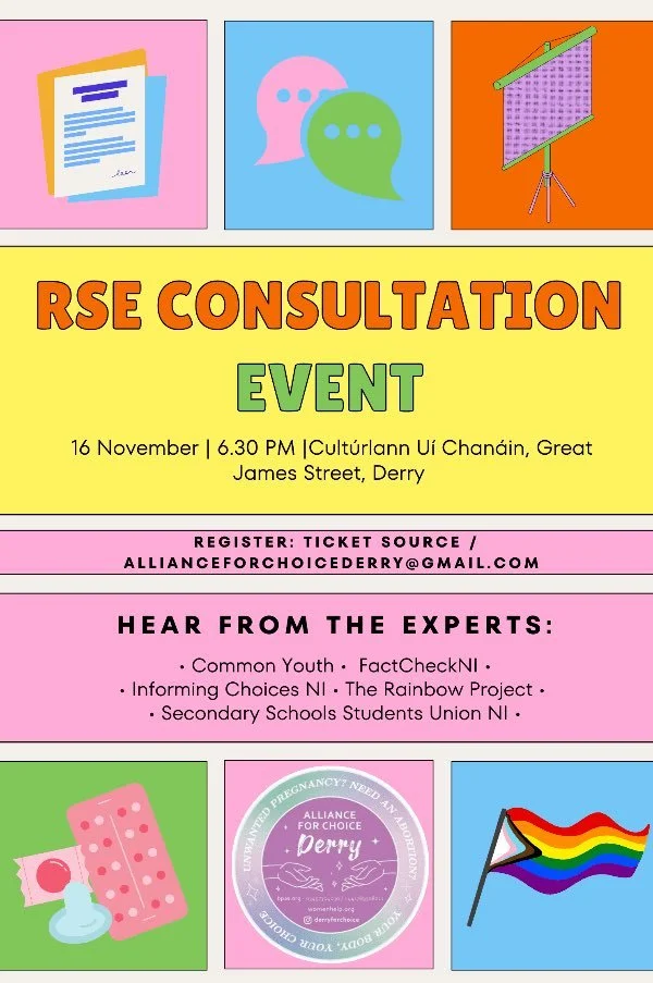 Alliance for Choice Derry are hosting an event all about RSE on Thursday 16th November from 6.30pm in Cultúrlann Uí Chanáin. We have the experts in the room, including: